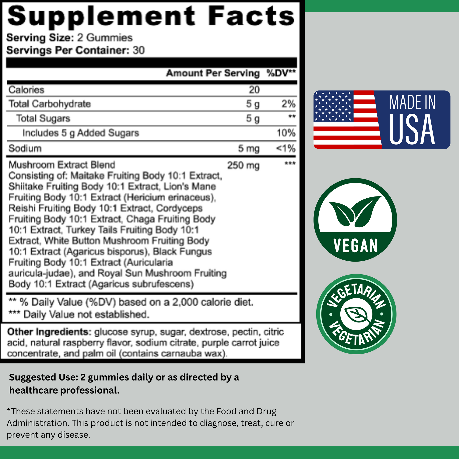 Maitake, Shiitake, Lion’s Mane, Reishi, Cordyceps, Chaga, Turkey Tail, White Button, Black Fungus, and Royal Sun mushrooms. It also contains glucose syrup, sugar, dextrose, pectin, citric acid, natural raspberry flavor, sodium citrate, purple carrot juice concentrate, and palm oil with carnauba wax.